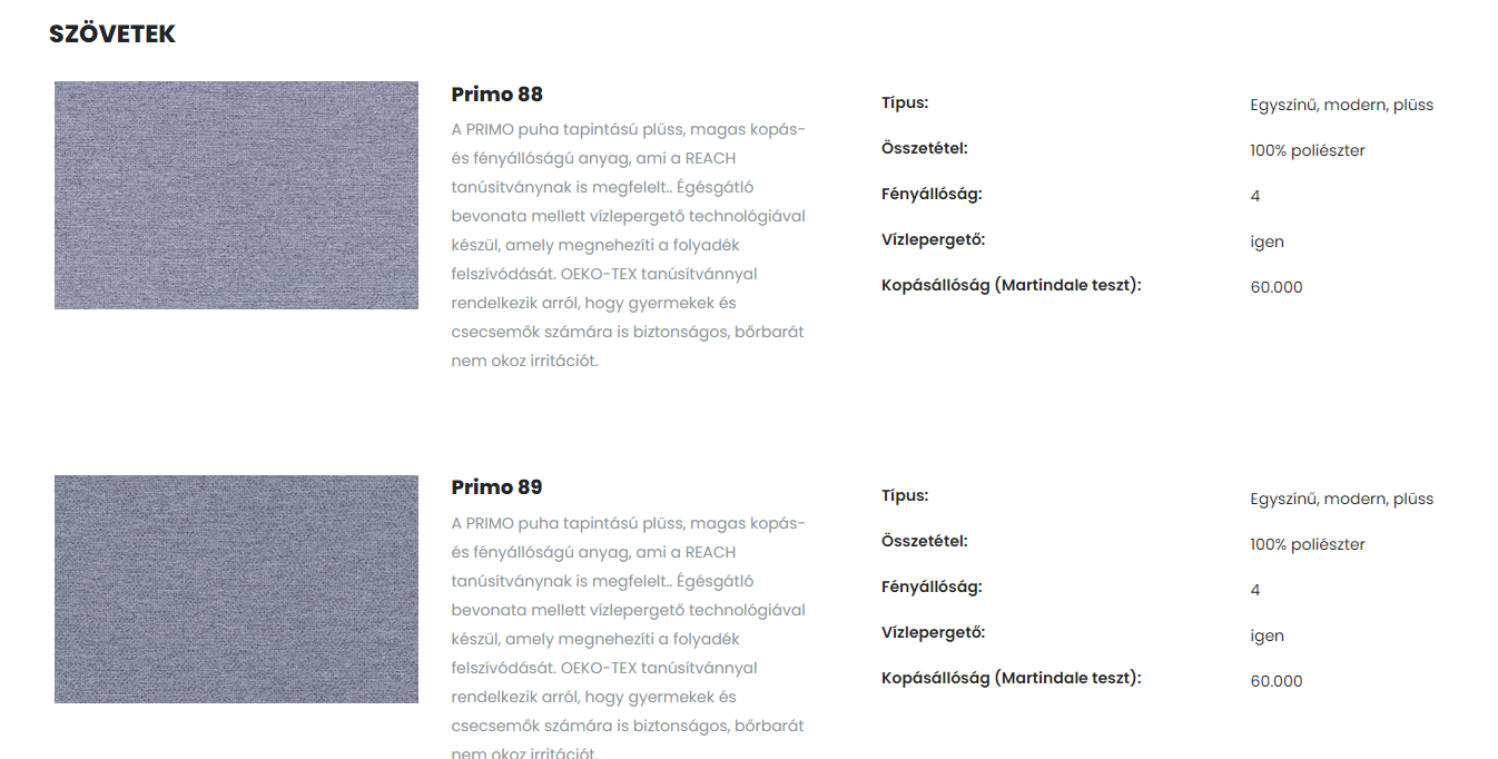 • Vízlepergető szövet:A szövet olyan tulajdonságokkal bír, ami megnehezíti a folyadék felszívódását, így könnyen tisztítható.